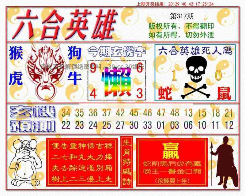 313期 今期生肖皆利字 珠机不离本期五 大门还是很不昏 吉人天相夺巧路 解译:大门还是很不昏指大肖牛马羊狗虎猪,吉人天相夺巧路指天肖牛马龙羊猴猪 九肖:牛马羊狗虎猪兔龙猴 特码:17.29.24.36.23.35.20.32 16.28.19.31.15.27.26.38 |